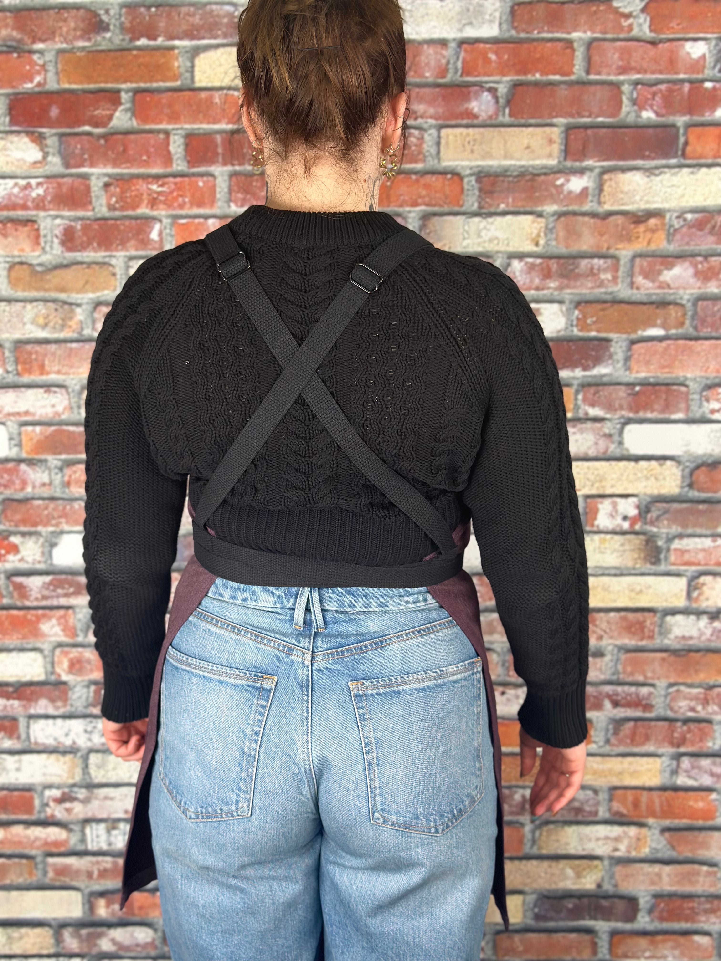 This apron features a 100% cotton base fabric that wears extremely well and has just a bit of stretch. It features two chest pockets and three lower pockets with black trim. The straps are 100% cotton.