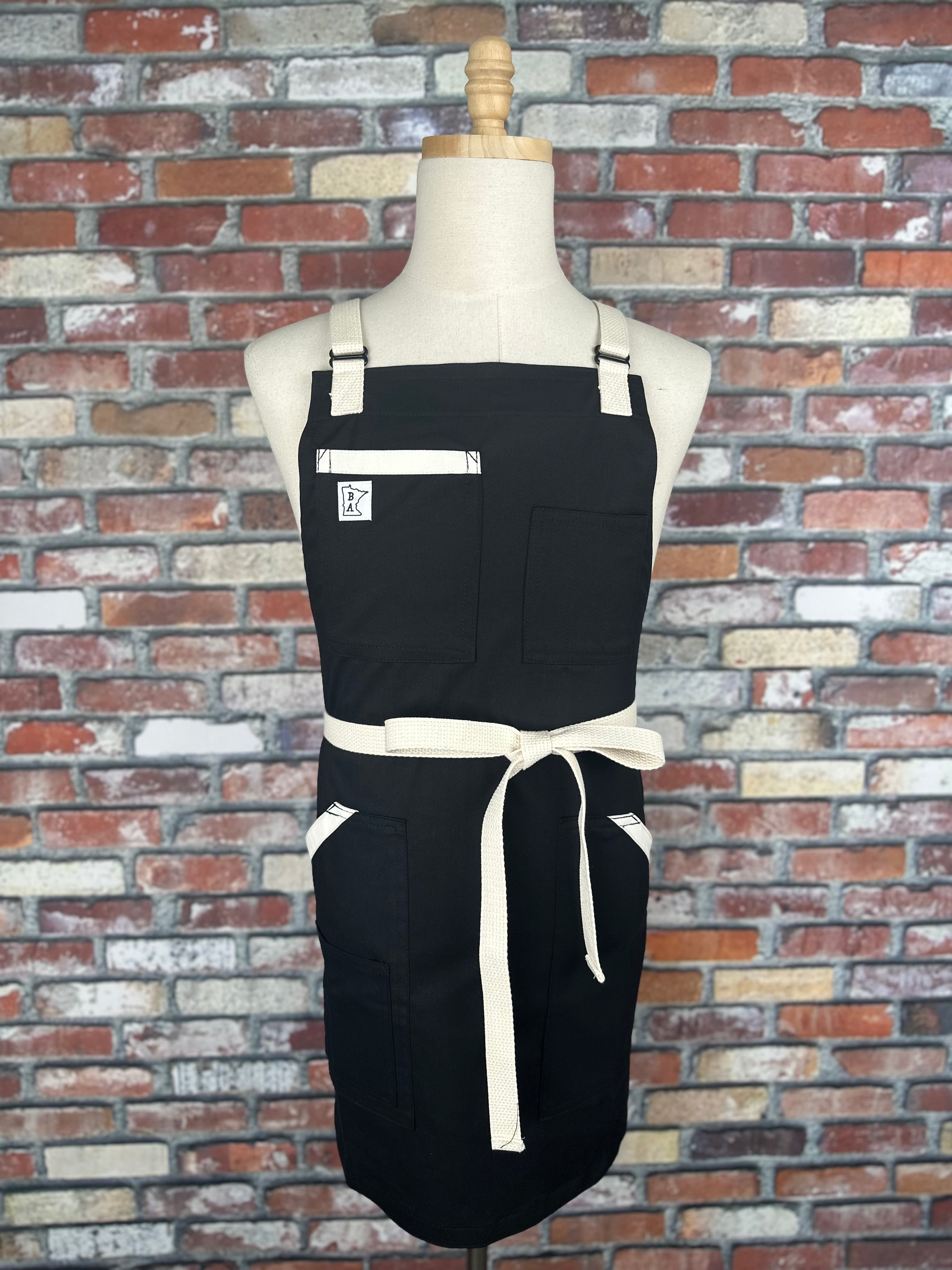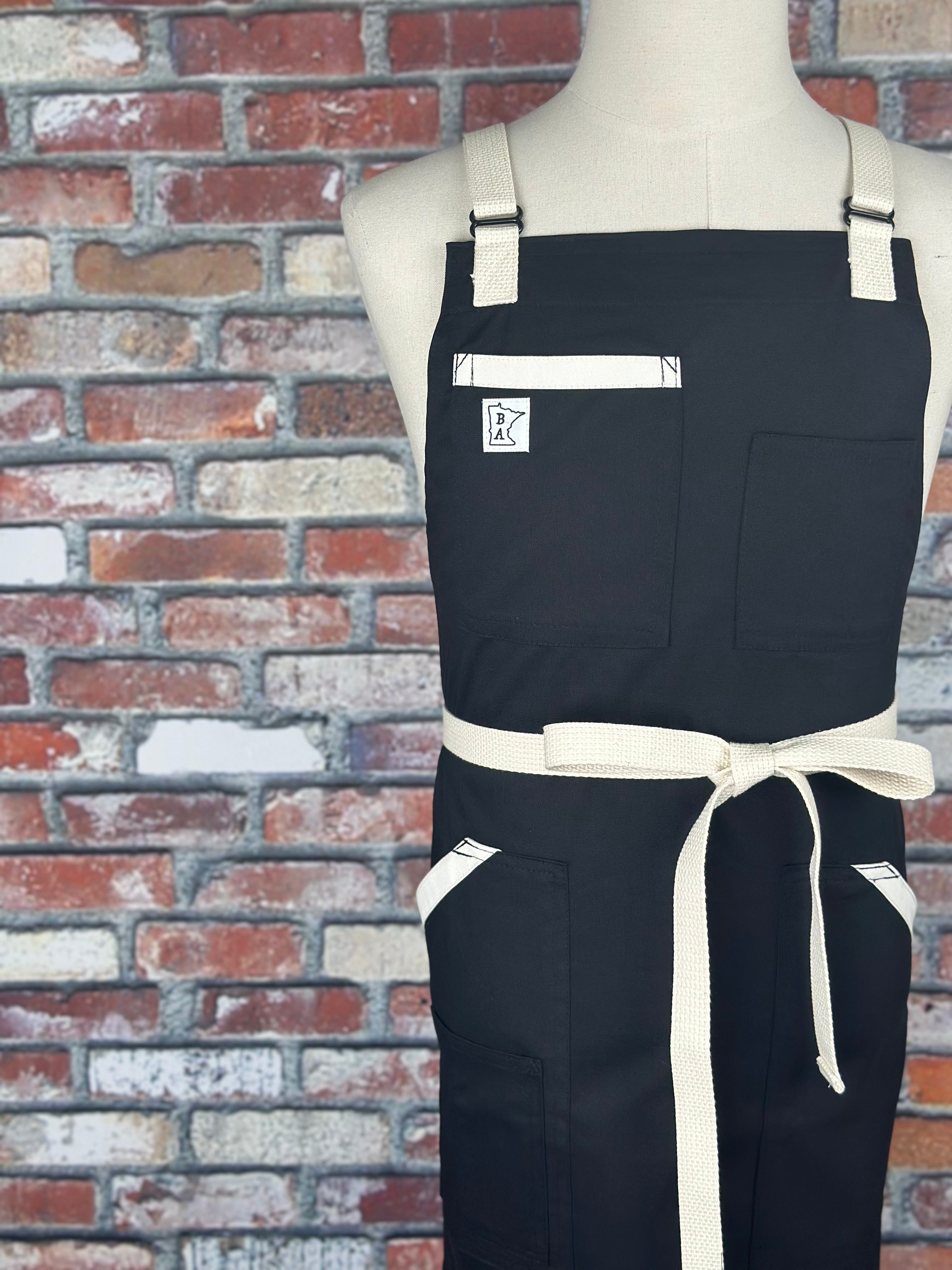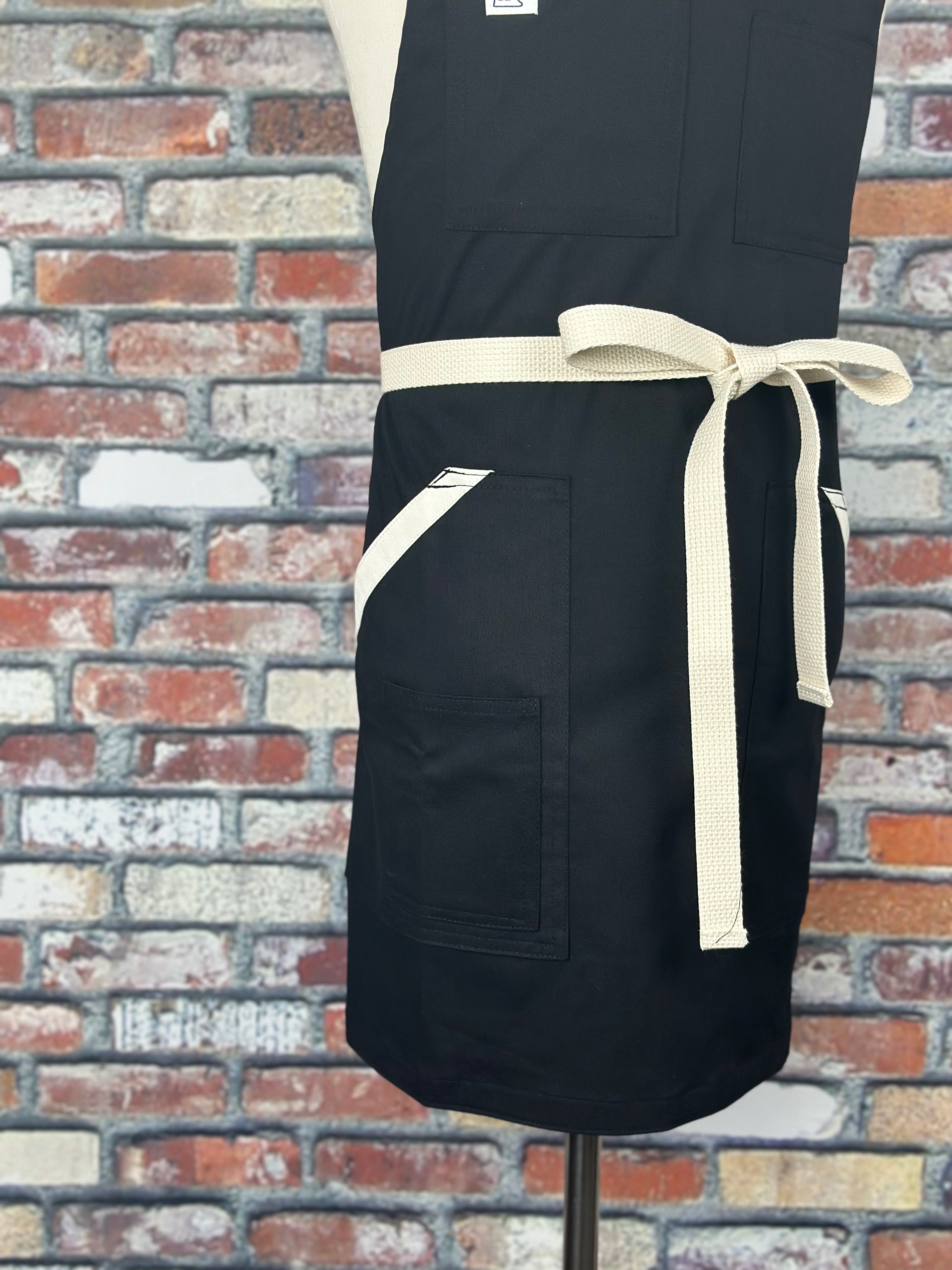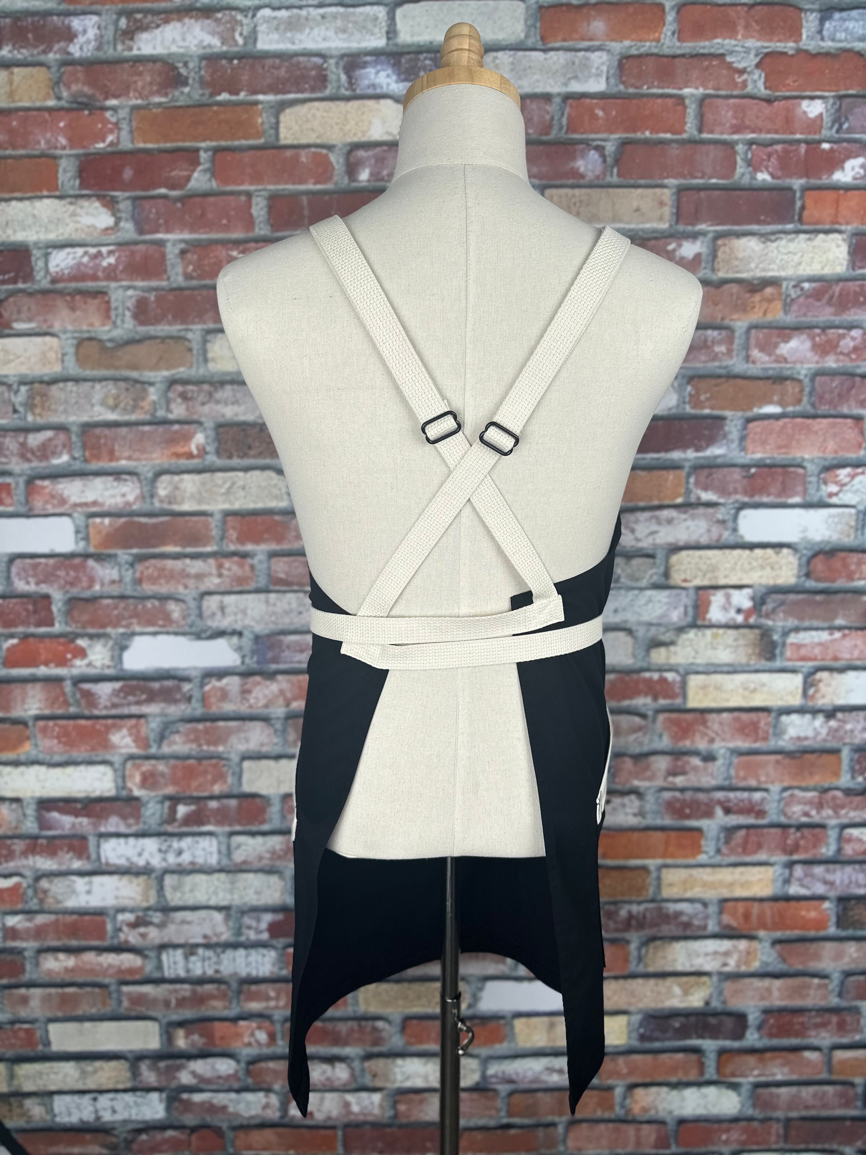Featuring a black base fabric, natural trim, and natural straps, this apron is timeless!