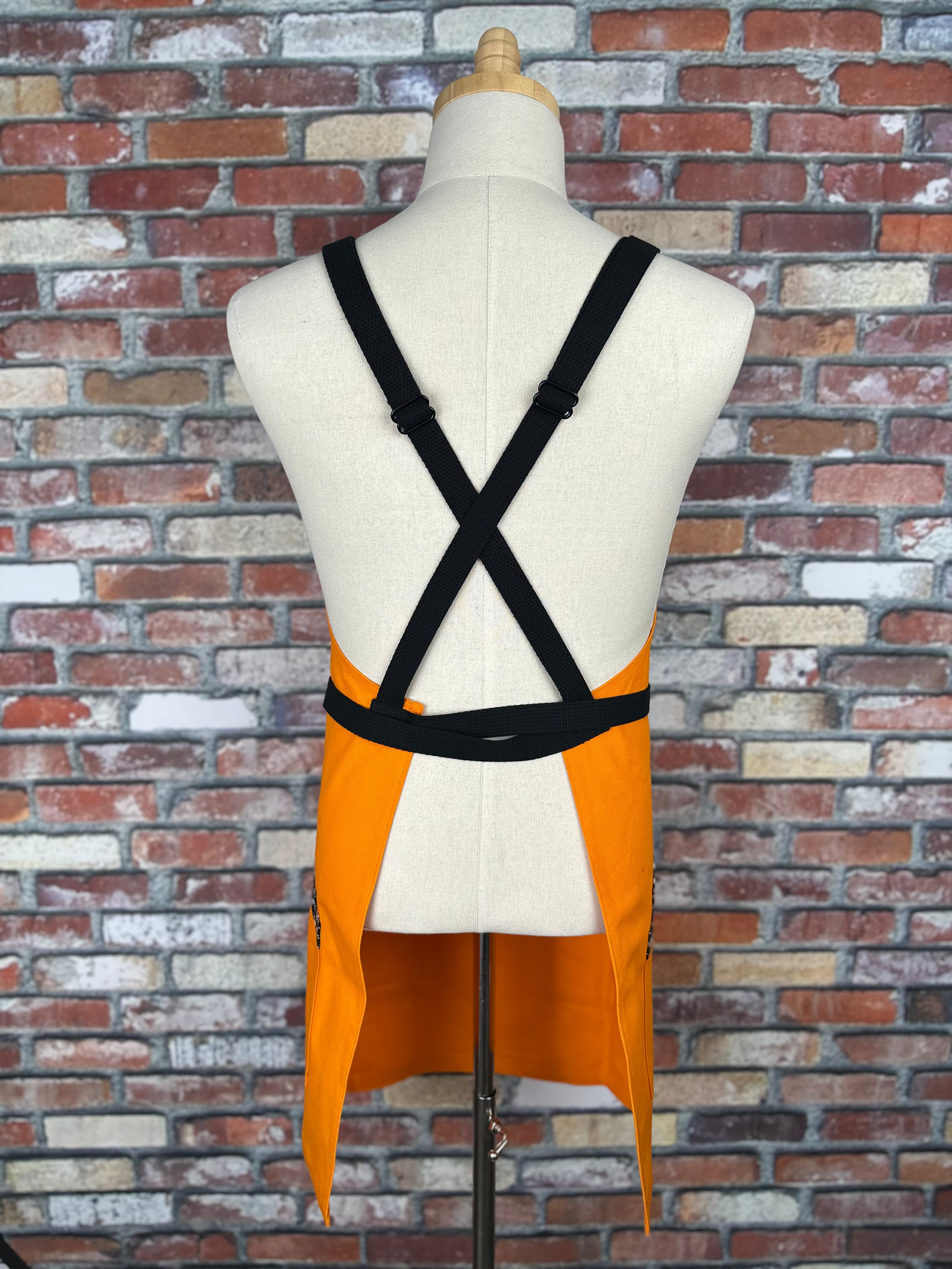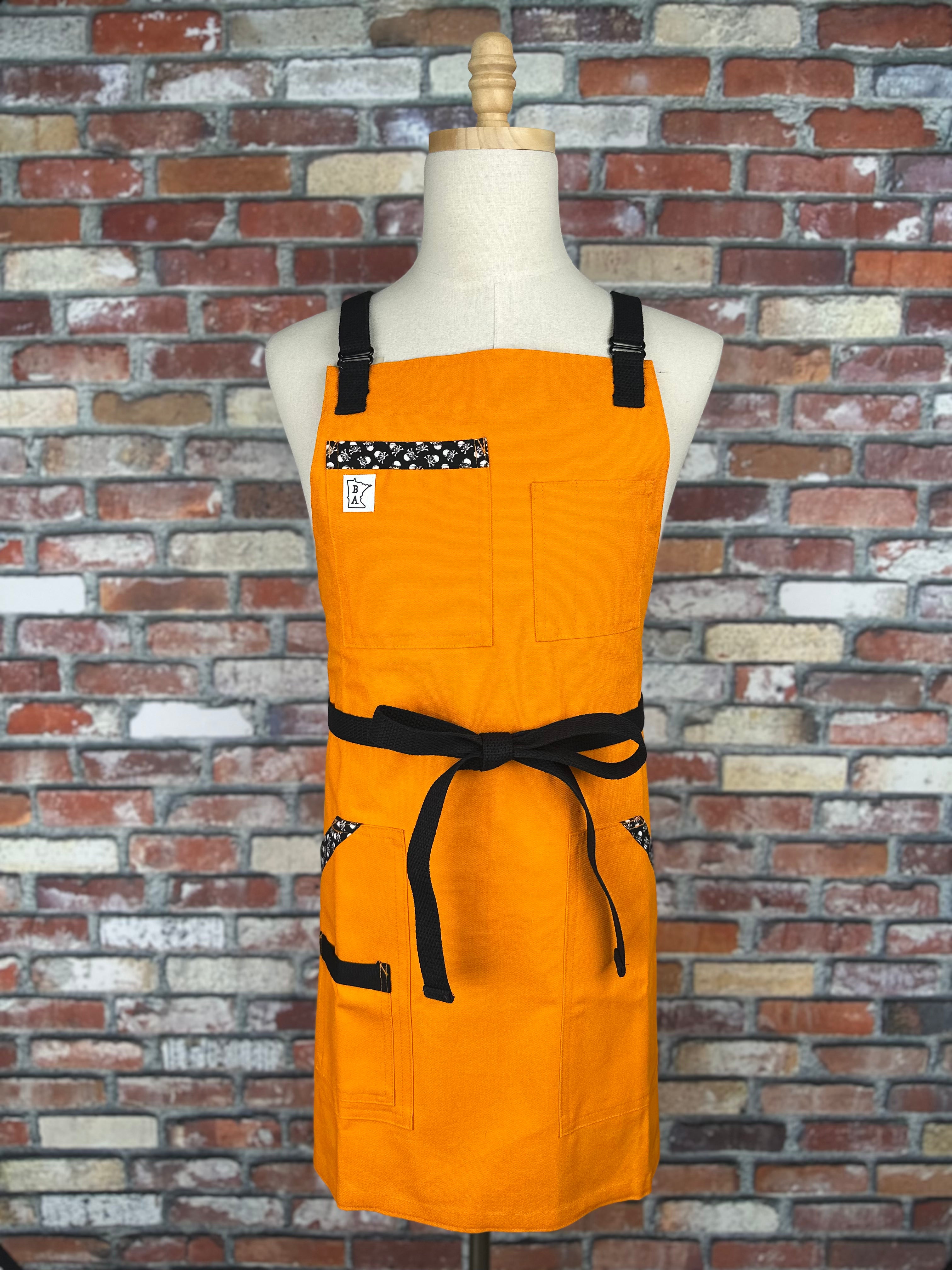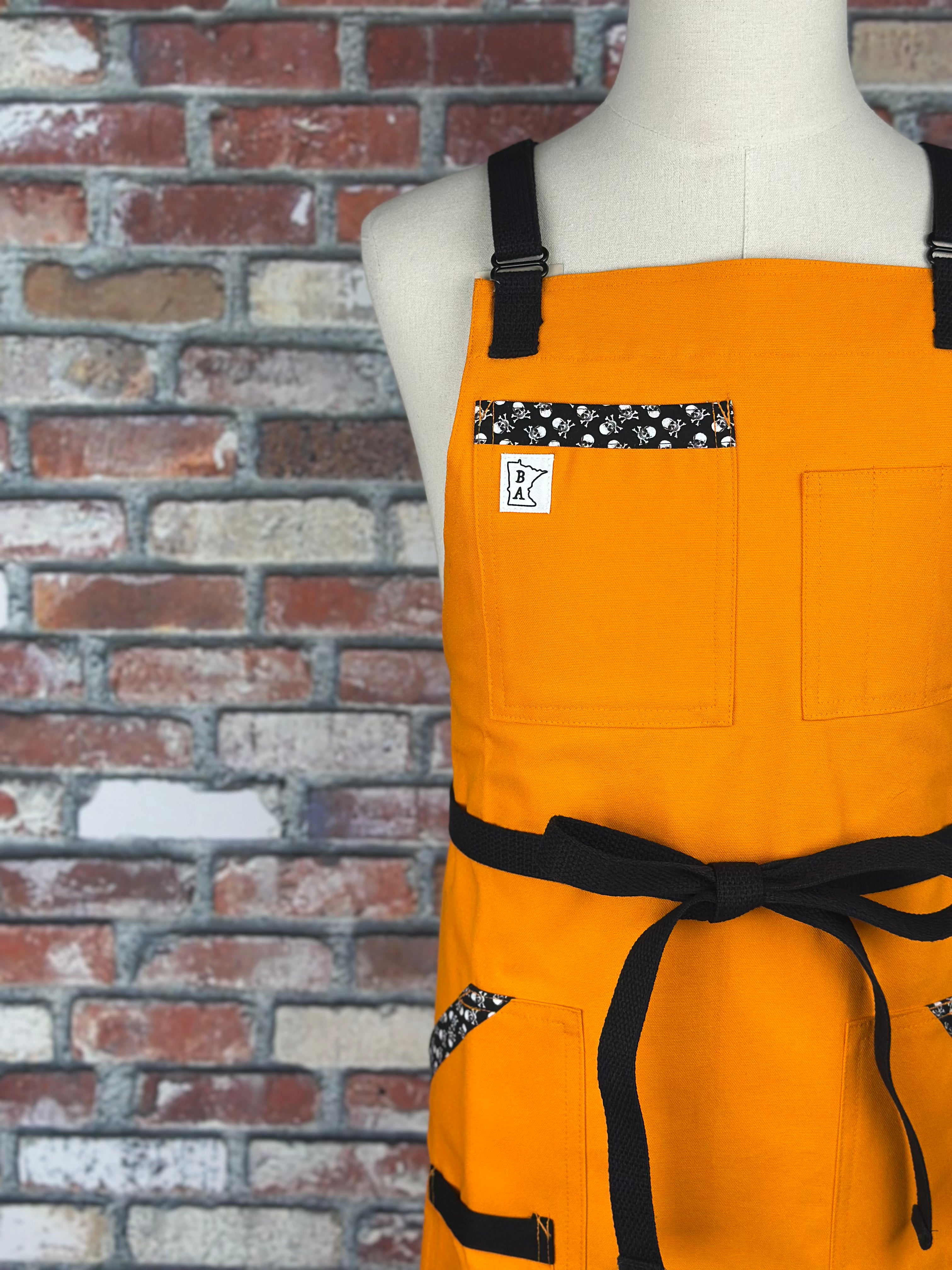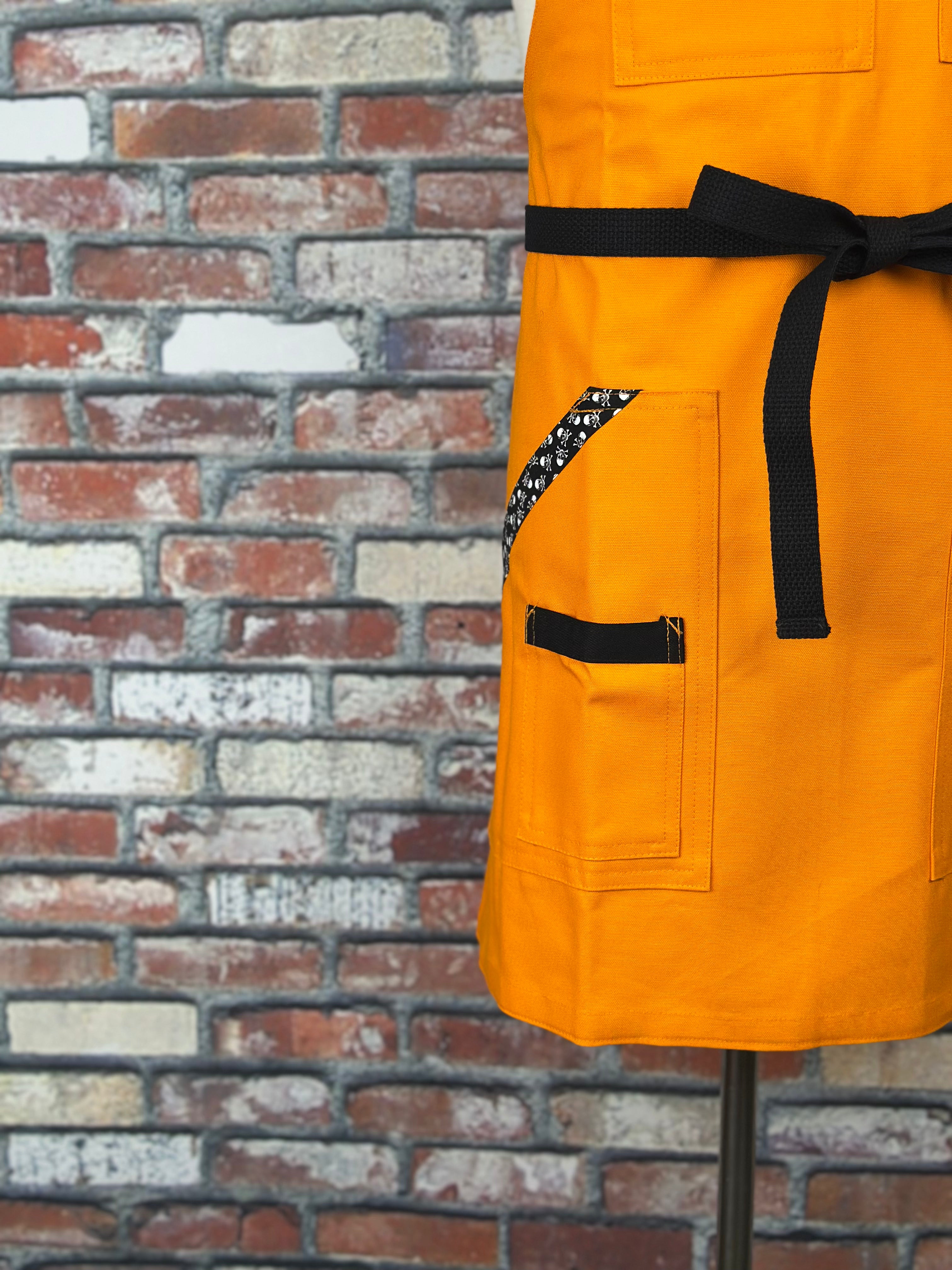 This apron starts with a vibrant orange base, black strapping , black hardware for adjustability and tiny skull and crossbones on our trim fabric. This one pops!