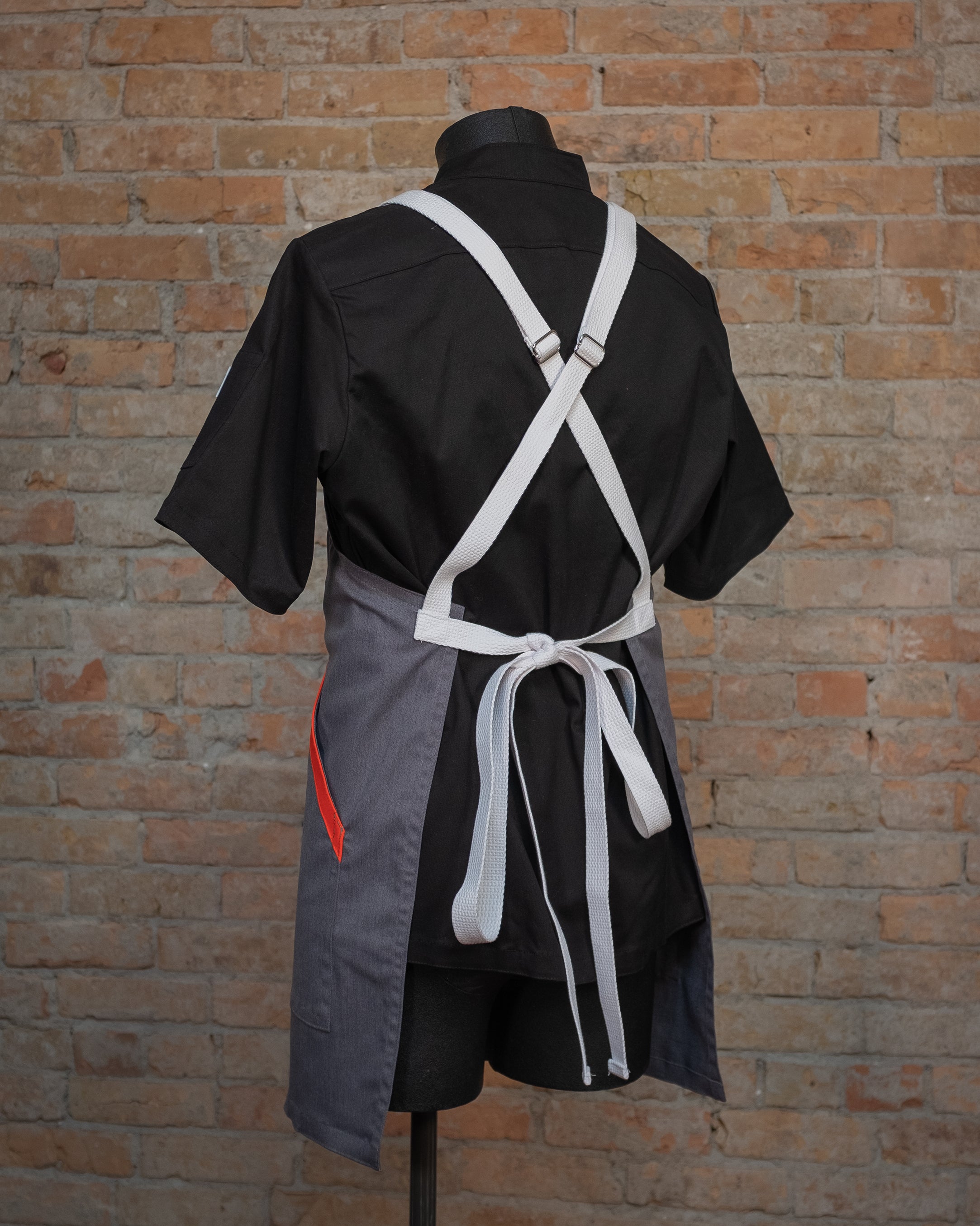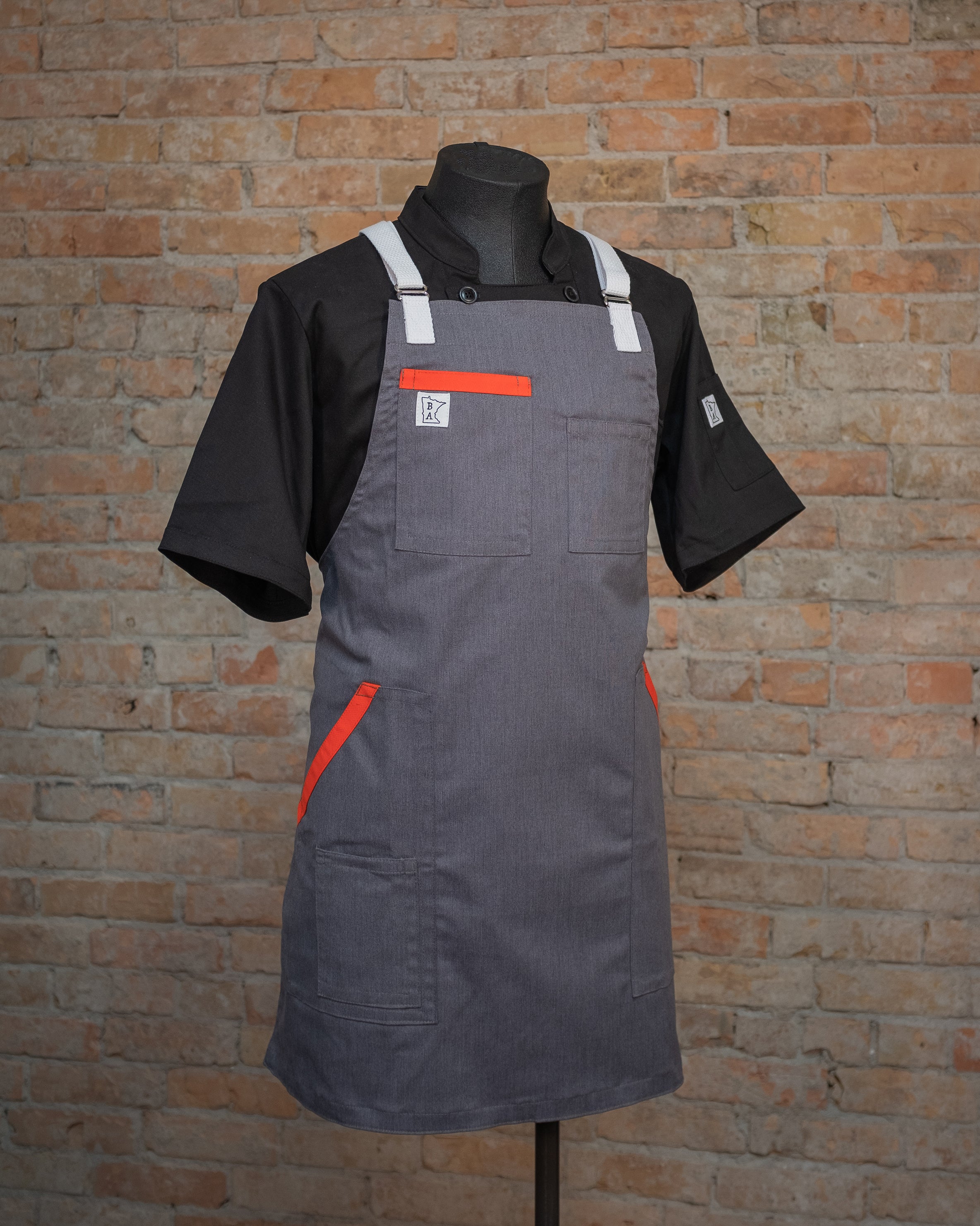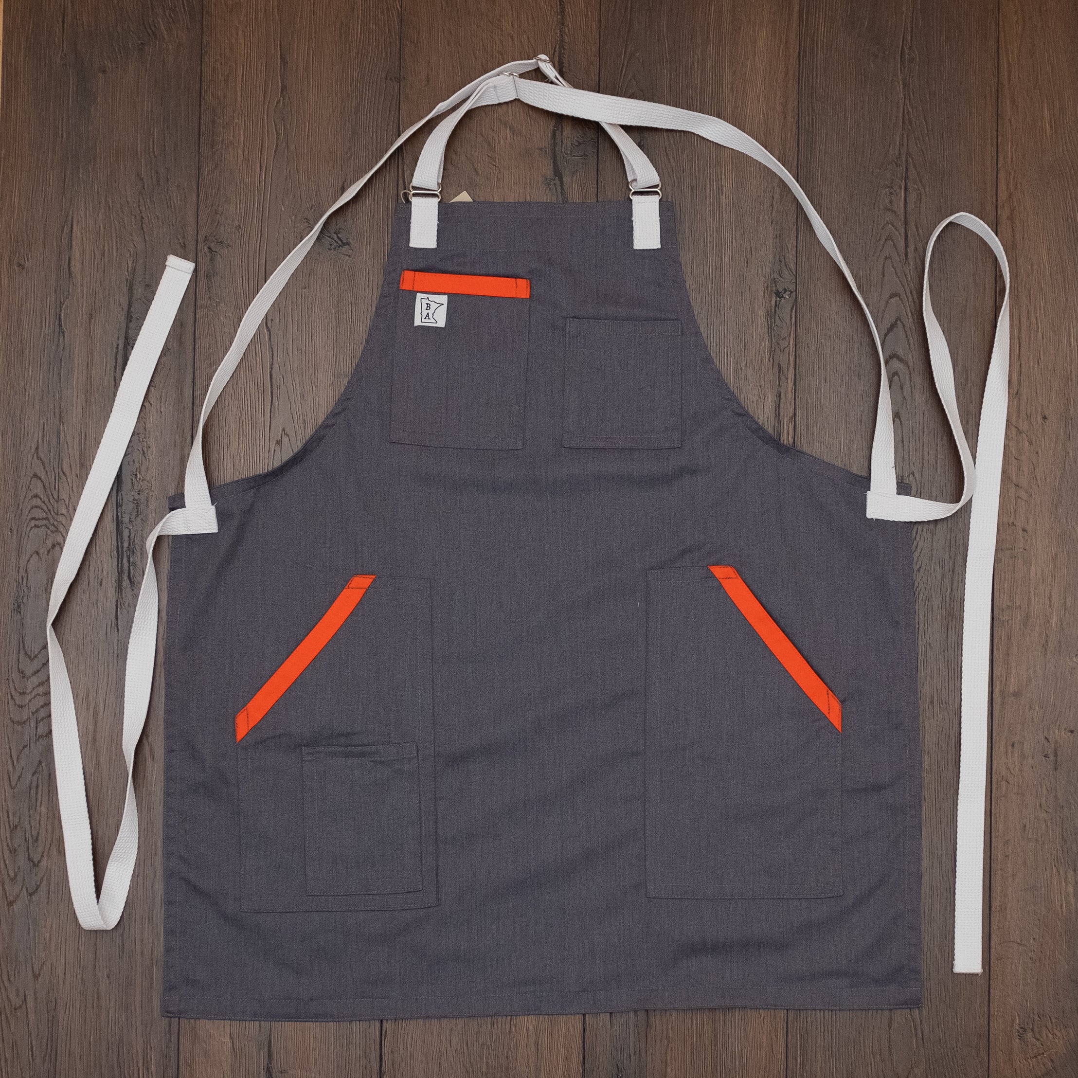 Dreamsicle is great to bring a little color into the kitchen! It features a 100% grey cotton base with a slight stretch, trimmed with orange, and bright white straps.