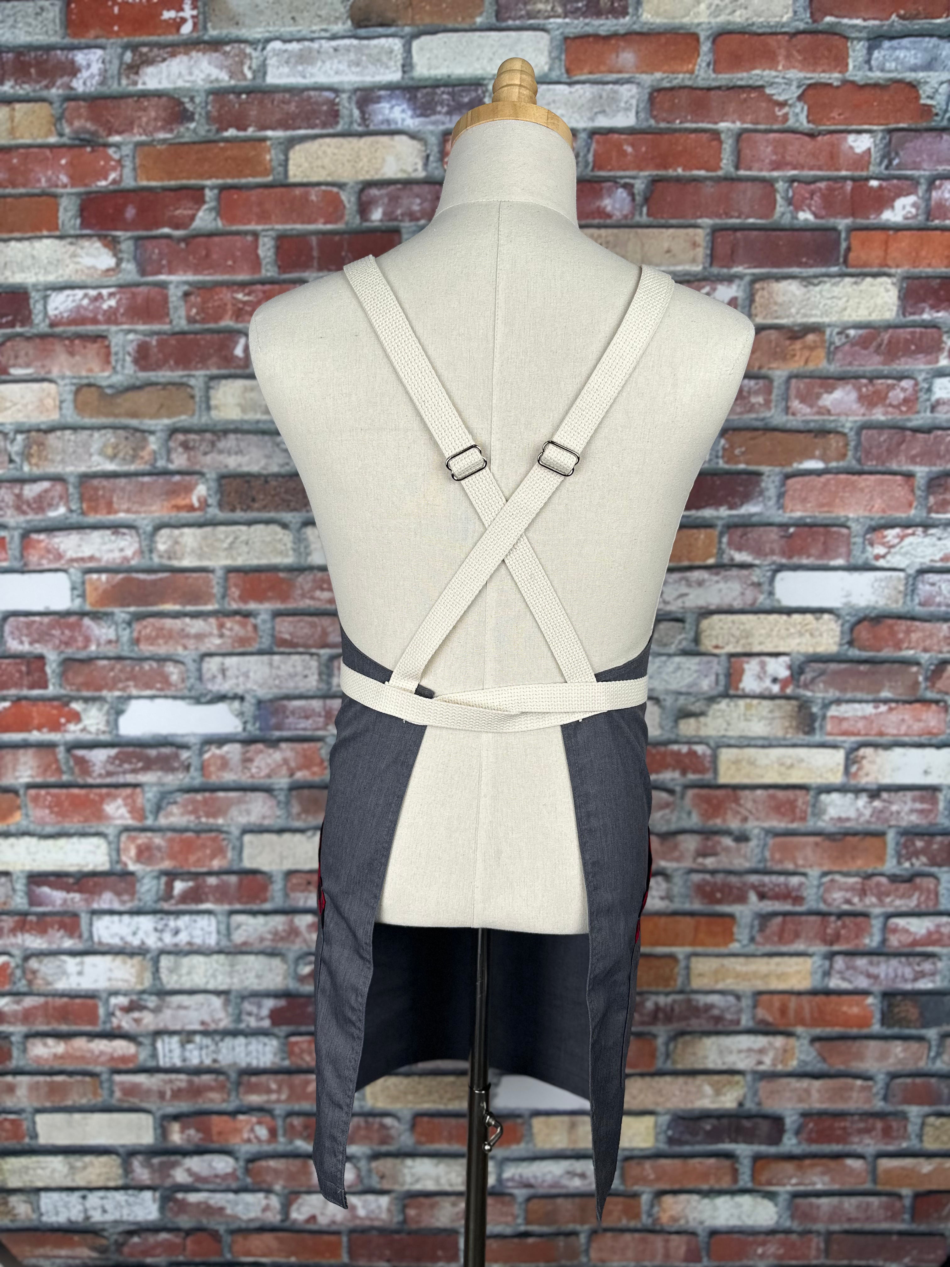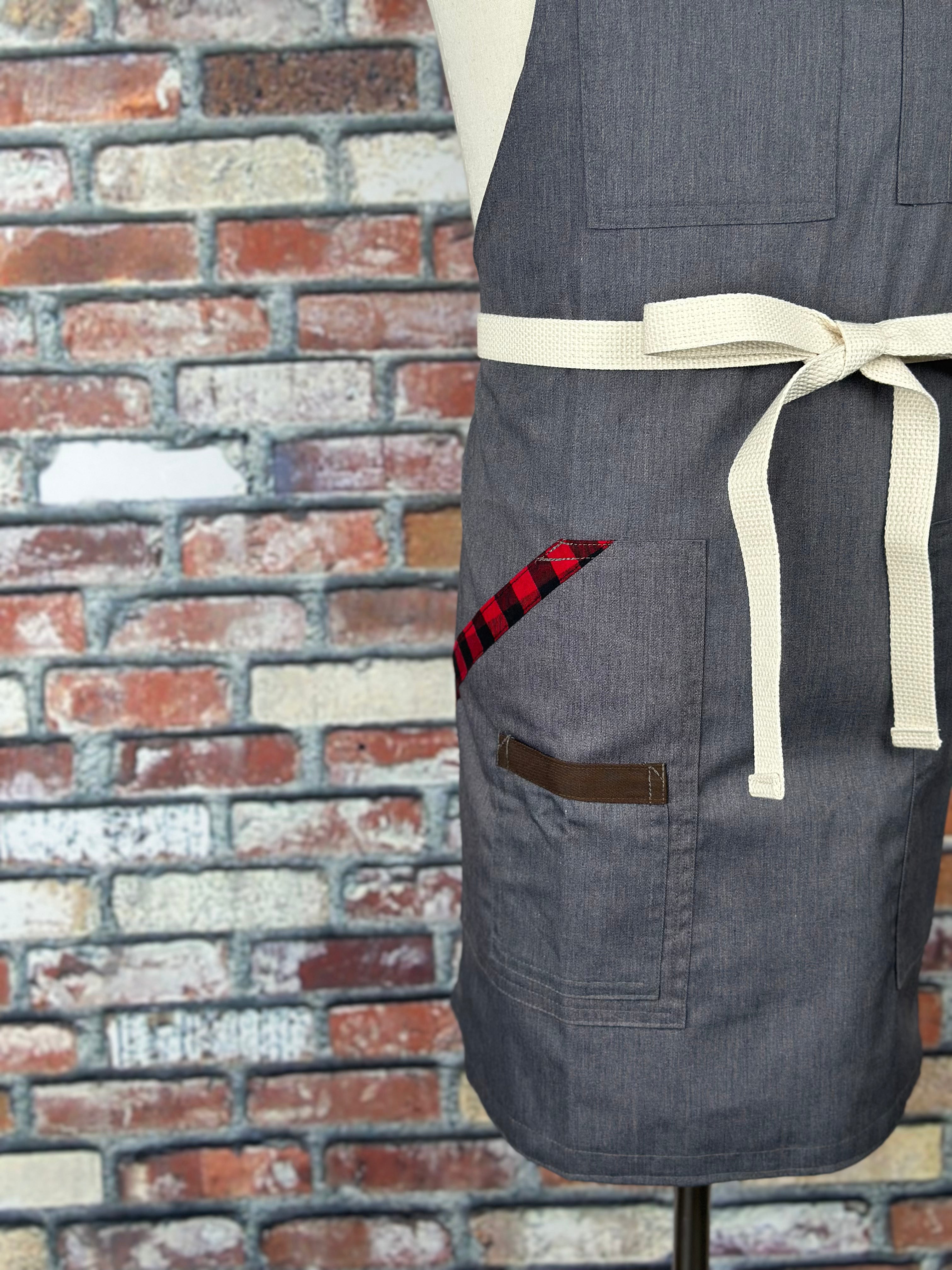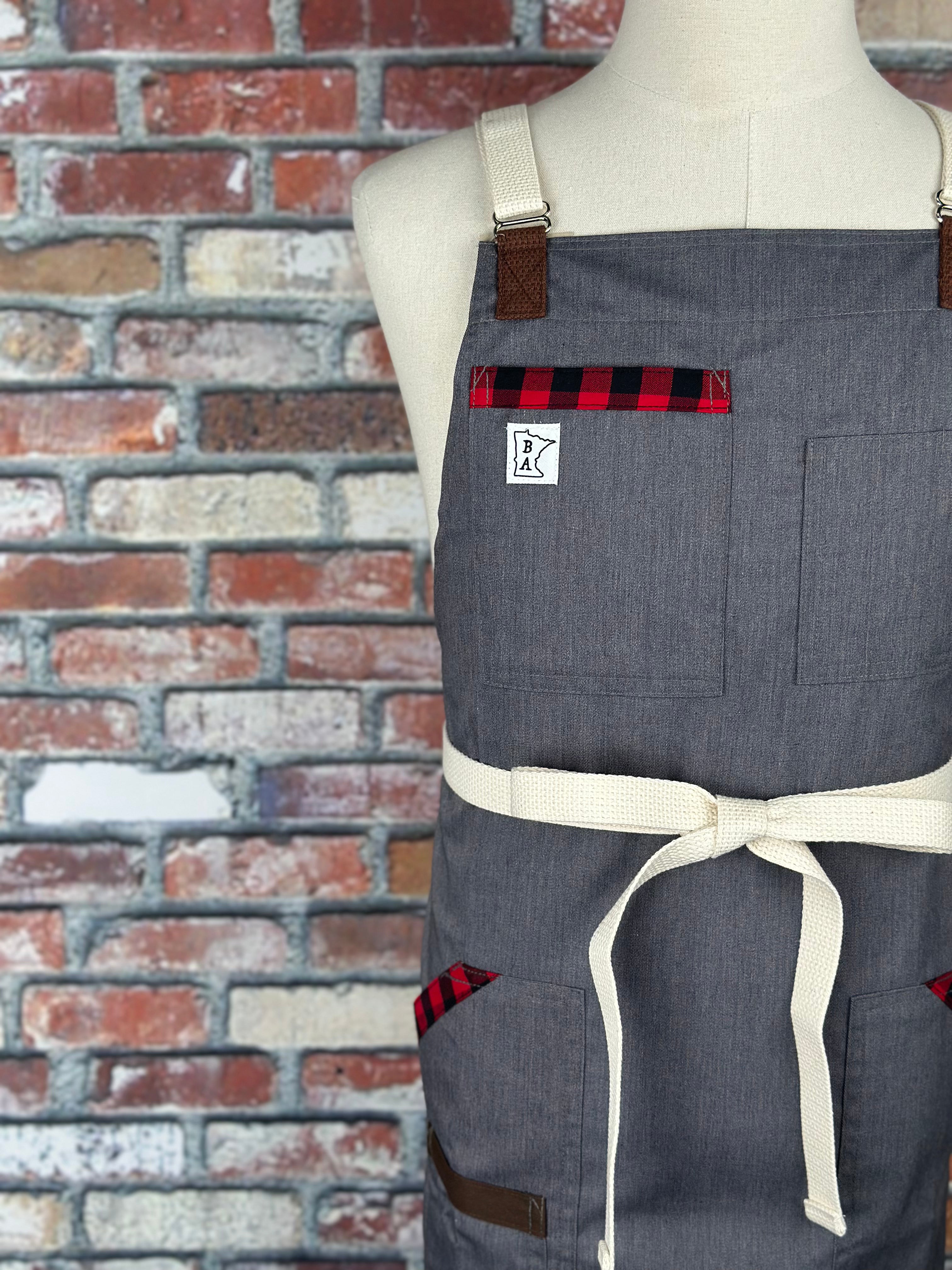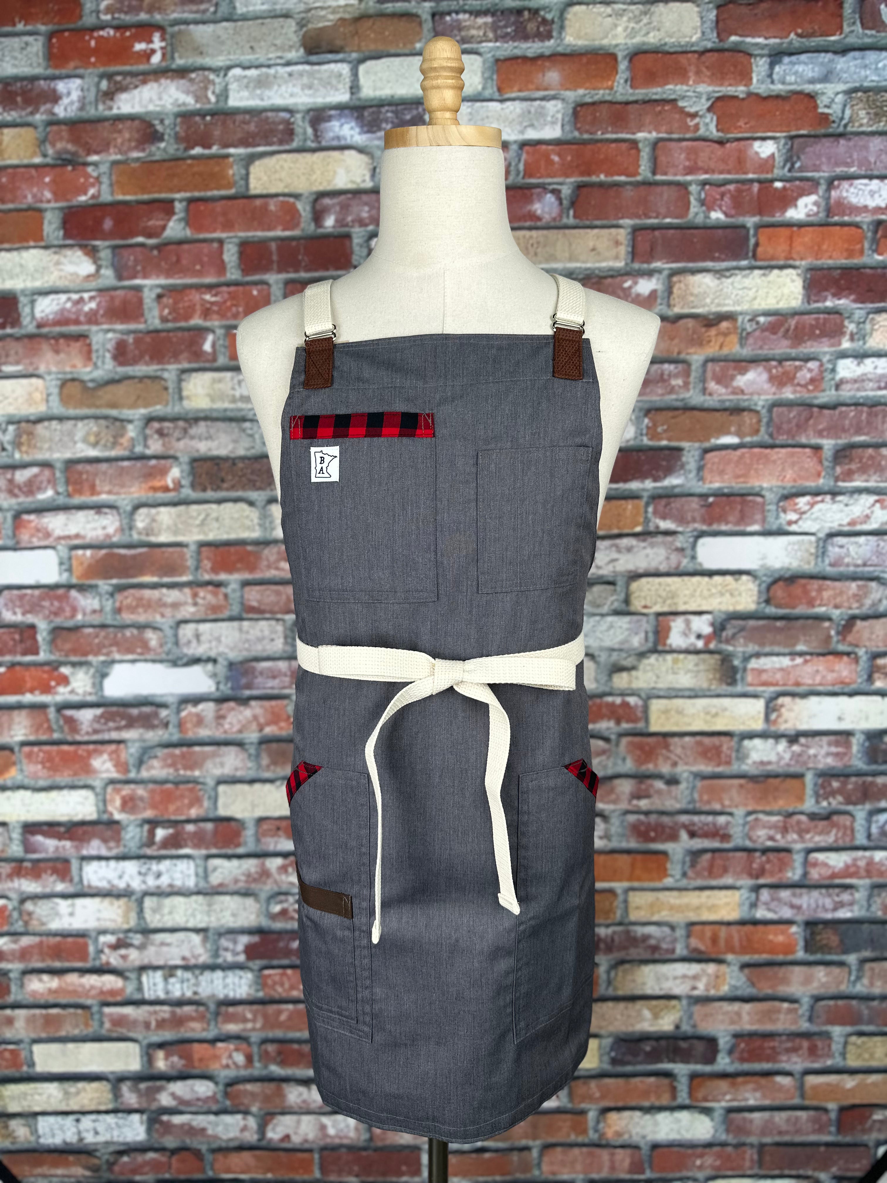 This apron features our favorite heather grey blended base fabrics, highlighted by a buffalo red flannel trim.