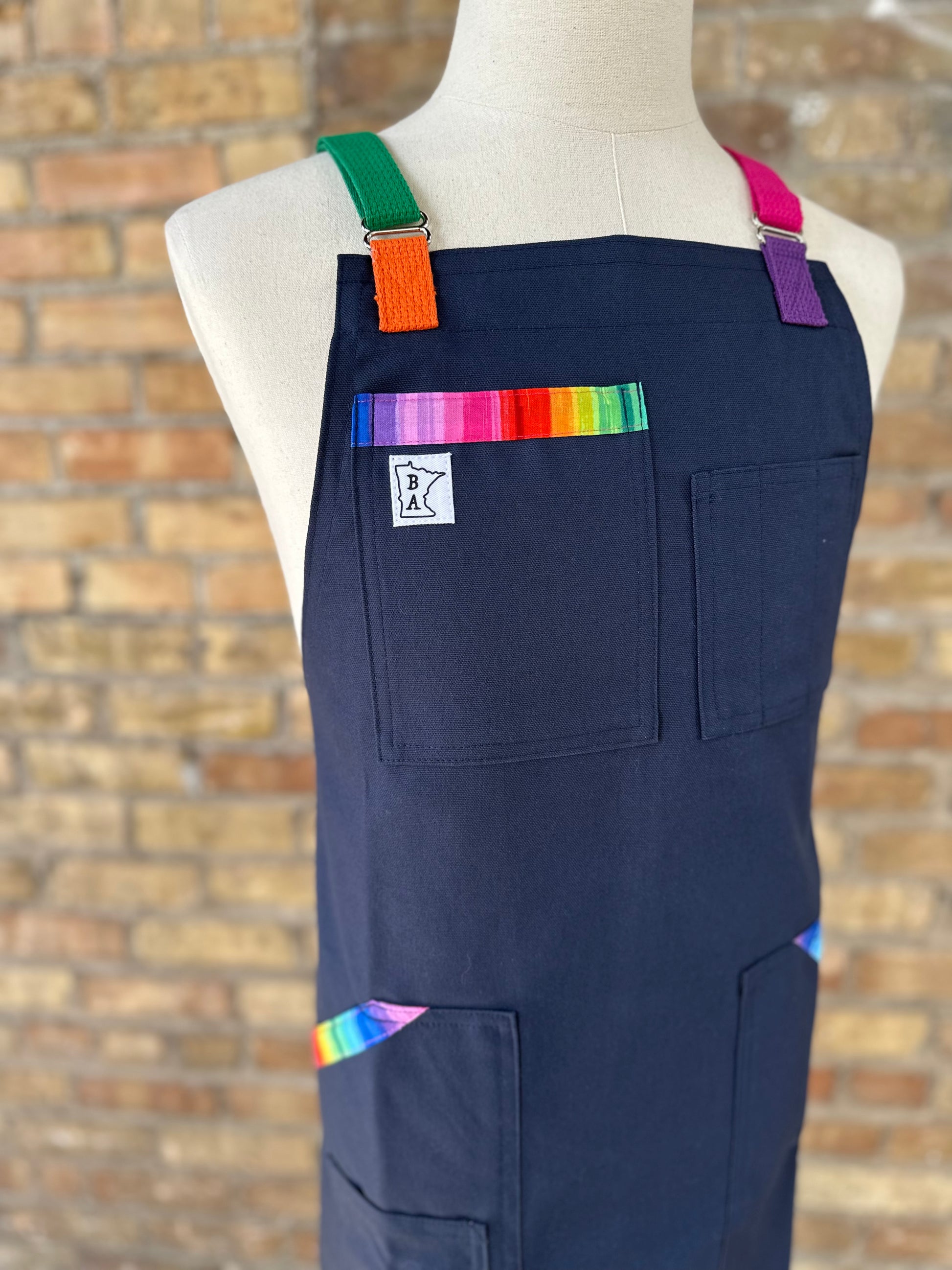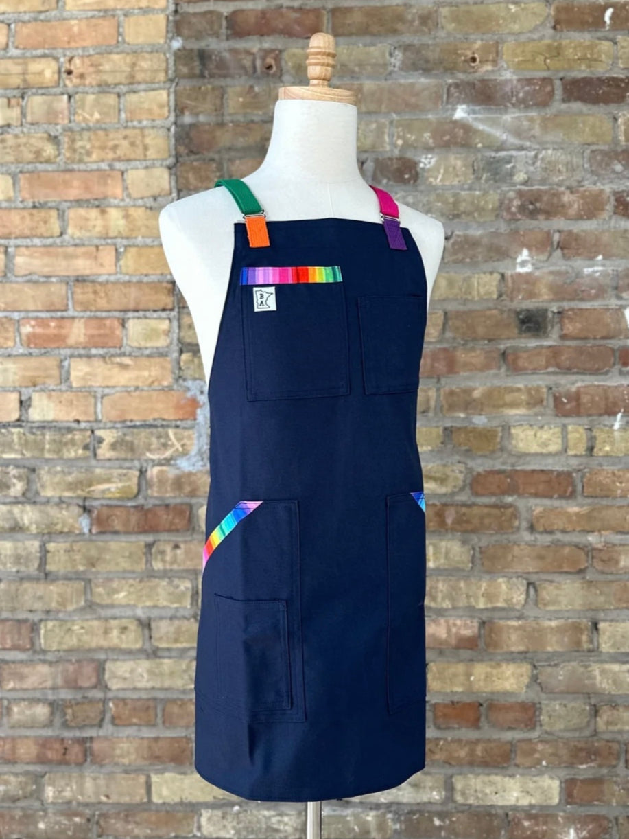 We used our favorite navy cotton duck cloth in navy for our revamped Pride apron. The trim is a beautiful brilliant cotton rainbow. We used chrome hardware and a rainbow strapping.